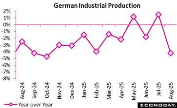 Germany’s industrial output experienced a notable downturn in August 2025, signalling a slowdown after earlier gains in July. Production fell by 4.3 percent from the previous month and 3.9 percent year-over-year after seasonal and calendar adjustments. This reversal contrasts with July’s modest growth of 1.3 percent, reflecting sectoral disruptions rather than a systemic decline.