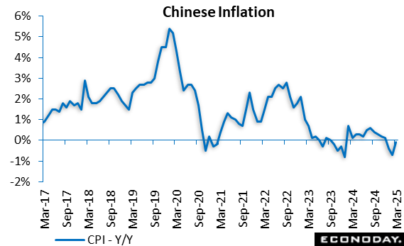 China’s headline consumer price index fell 0.1 percent on the year in March after dropping 0.7 percent in February and fell 0.4 percent on the month after a previous decline of 0.2 percent. Food prices fell 1.4 percent on the year, partly offset by an increase of 0.2 percent in non-food prices. Producer price inflation data also published today showed ongoing weakness in price pressures.