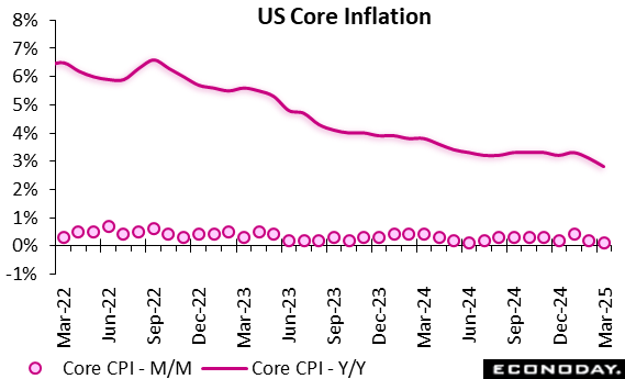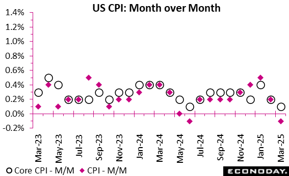 Core CPI, excluding food and energy prices, are up by just 0.1 percent, easing off further after rising by 0.2 percent in February, and +0.4 percent in January. Consumer prices less food and energy rose 2.8 percent from March 2024, after rising by 3.1 percent on an annual basis in February.