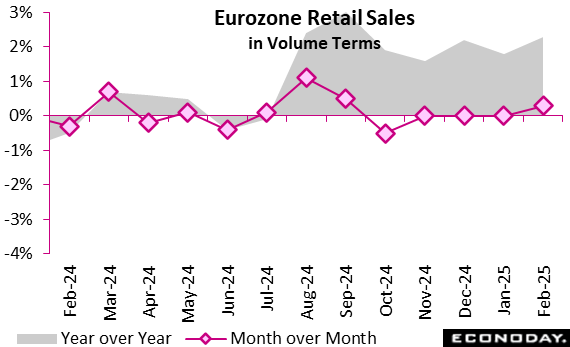 Retail trade in the euro area increased by 0.3 percent in February compared to January, following a flat start to the year due to the revisions for January. This suggests a cautious rebound in consumer activity amid broader economic uncertainty. On an annual basis, retail sales grew by a more notable 2.3 percent, reflecting a recovery in household demand across key sectors.