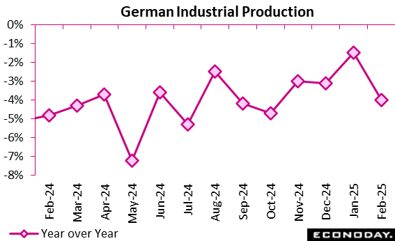 In February, Germany’s industrial output contracted by 1.3 percent from the previous month and fell 4.0 percent year-over-year, highlighting persistent weaknesses in key sectors. While the broader three-month trend showed a slight 0.1 percent increase, this did not mask sector-specific downturns. The construction industry led the decline with a 3.2 percent drop, followed by steep falls in food production (minus 5.3 percent) and energy output (minus 3.3 percent), reflecting a combination of seasonal factors and structural pressures.