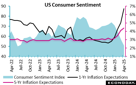 U.S. consumer sentiment continues its downward spiral – declining each month so far in 2025 – with April’s preliminary estimate coming in at 50.8 vs. March’s final reading of 57.0 and 64.7 in February, below expectations for 55.0 in the Econoday survey of forecasters.