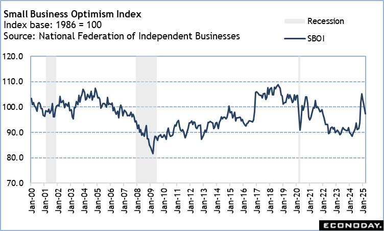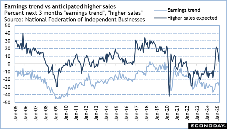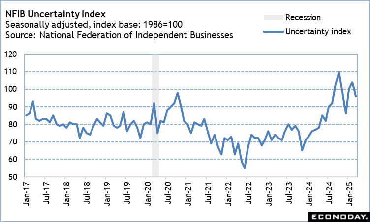 The March NFIB small business optimism index of 97.4 was below the 51-year average of 98 for the first time since 93.7 in October 2024. The post-election bounce has nearly worn off. Seven of 10 components are down for March, two are up, and one is unchanged. Importantly, there is a precipitous slide in two forward-look components – expectations for the economy to improve and higher sales expectations. If the NFIB uncertainty index shows a 4-point improvement to 96 in March, it remains unusually elevated.