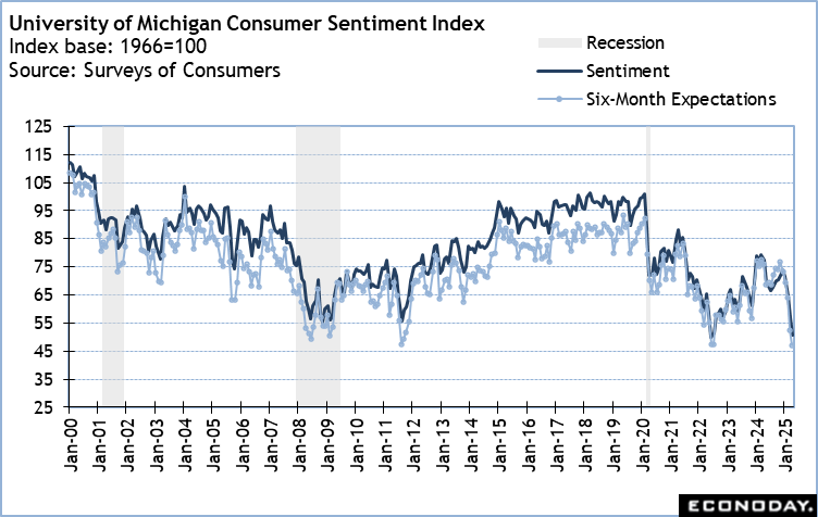 The University of Michigan consumer sentiment index fell 6.2 points to 50.8 in the preliminary April report, barely above the record low of 50.0 in June 2022. The current conditions index fell 7.3 points to 56.5, the lowest since 46.6 in October 2022. The expectations index – for conditions about 6 months from now – dipped 5.4 points to 47.2, the lowest since 47.3 in July 2022. The expectations index is well into recessionary territory for the near future.