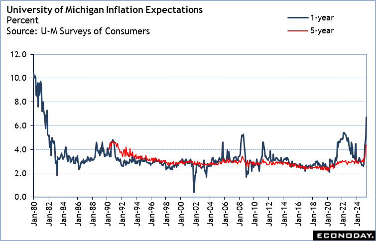 There is bad news for the FOMC in the readings of inflation expectations. The 1-year inflation expectations measure ballooned to 6.7 percent in early April from 5.0 in March, and which hasn’t been seen since 1981 when the Volcker Fed was working to break the back of inflation. Of course, for monetary policy, it is the medium term which is more important. However, 5-year inflation expectations measure is up to 4.4 percent in early April from 4.1 percent in March. This sort of reading has not been seen since 1991. While a lot of this can be attributed to the whiplash of news related to tariffs, Fed policymakers will have a hard time reassuring the public that inflation is not and will not be as bad as the surveys suggest, and that inflation expectations have not lost their anchor and along with it the Fed’s credibility as an inflation fighter. The FOMC will not be cutting rates unless and until it is clear the swing higher is of temporary duration and will calm down once White House policy looks stable.