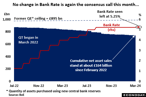 In addition to a steady Bank Rate, there is unlikely to be anything new on the QT programme. Since last September, this has sought to reduce the stock of gilts held in the Asset Purchase Facility (APF) by £100 billion to £658 billion over the year to October 2024 and is well on track. As of mid-March, net disposals had shrunk outstandings to under £731 billion, implying a fall in total QE assets of about £164 billion from their peak level in the first quarter of 2022.
