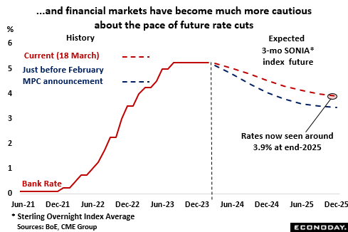 The shift in expectations at least in part reflects some signs that the previously improving trend in inflation is running out of steam. The February data will be updated on Wednesday but in January, the annual headline rate was only steady at 4.0 percent and the core rate similarly unchanged at 5.1 percent, the latter more than 3 percentage points above target. In addition, inflation in services (6.5 percent) edged up for a second straight month. Looking ahead, a 12 percent cut in the energy price cap in April could see the overall rate even dip below 2 percent next quarter but this is likely to be just temporary. A further easing in underlying pressures is needed if the target level is to be met on a sustainable basis and this will require a more marked deceleration in wage growth. Still, the MPC can take some heart from the bank’s latest inflation expectations survey, released last Friday. This found consumers’ view of the rate 1-year ahead falling to 3.0 percent from November’s 3.2 percent and 5-years ahead easing from 3.2 percent to 3.1 percent.