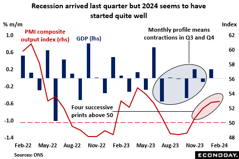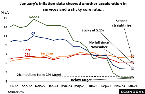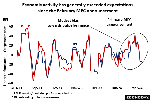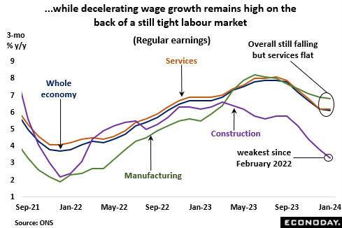 To this end, the latest official data showed a further cooling in whole economy regular earnings. Even so, at an annual 6.1 percent, the rate for the three months to January was only down a tick and still uncomfortably firm. Moreover, in services, where some surveys have pointed to a recent pick-up in wage pressures, the rate was just flat at 6.2 percent. Adding to a sense of caution will be the bank’s own regional agents’ survey which suggested that the average yearly rise in pay settlements in 2024 would be 5.4 percent, only slightly lower than in 2023 and ominously high in the context of the inflation target.