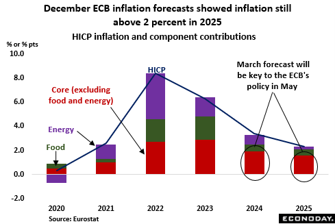 In its December forecast, HICP inflation was projected to average 8.4 percent in 2022, before decreasing to 6.3 percent this year, 3.4 percent in 2024 and 2.4% in 2025. Excluding food and energy, the rate was seen falling from 4.2 percent in 2023 to 2.4 percent in 2025. In other words, both measures ended the forecast horizon still above target. The new projections will have a big say in upcoming policy decisions and will probably need to be clearly lower if the bank is to feel comfortable limiting any hike in May to just 25 basis points.