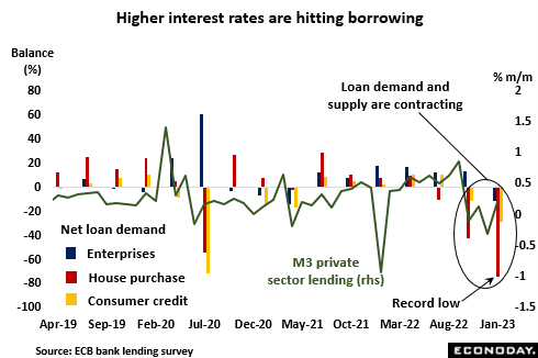 Even if current interest rate levels are not yet having the desired impact on inflation, they are feeding through into private sector lending. According to the ECB’s latest bank lending survey, loan demand from enterprises and households contracted last quarter for the first time since the first quarter of 2021, in the midst of the pandemic. Indeed, demand for home loans fell by the most on record. Reflecting this, average monthly growth of M3’s private sector lending counterpart slowed from 0.7 percent in the third quarter of last year to minus 0.1 percent in the period just ended. Tighter financial conditions will hit economic activity in general over coming months and will ultimately help to drive inflation down.