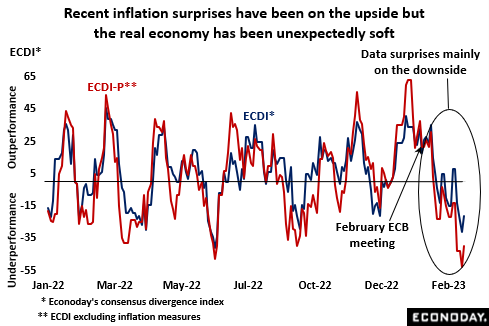 In fact, outside of positive inflation shocks, economic indicators released since the February ECB meeting have typically surprised on the downside. Econoday’s consensus divergence index (ECDI), which measures how overall economic activity has been performing versus market expectations, has been below zero for most of the time. Indeed, the latest reading (minus 21) would be significantly more negative but for the buoyancy of inflation. Hence, the ECDI-P, which omits inflation surprises, now stands at minus 40, only just above its record low. However, while this makes for downside risk to first quarter GDP, an underperforming real economy will not overly trouble a central bank so focussed on achieving its price stability goals.