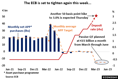 In terms of policy, Thursday’s announcement should be something of a damp squib. Although supposedly no longer offering forward guidance, the February statement made it clear that the ECB intends to raise its key interest rates by a further 50 basis points. This would put the (still key) deposit rate at 3.0 percent, the refi rate at 3.5 percent and the rate on the marginal lending facility at 3.75 percent. It would also boost the cumulative tightening since last July to some 350 basis points.