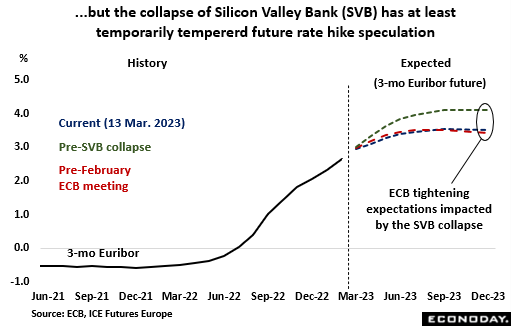 Following the February meeting, market expectations for ECB tightening in 2023 became notably more aggressive. In fact, shortly before news about SVB, from then nearly 3.0 percent, futures saw 3-month money rates continuing to rise throughout the year to above 4.0 percent in December. That was more than 50 basis points higher than anticipated just before last month’s announcement. However, in the wake of SVB’s problems, such expectations have been trimmed and the future profile now looks little changed from February with rates again put at close to 3.5 percent at year-end. That said, the decline in 2024 is still shallower and even in June 2024, rates are seen around 3.3 percent. How long the SVB effects last remains to be seen but investors will be watching closely for any commentary on the subject on Thursday.