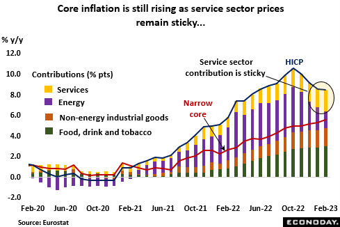 In any event, the outlook for interest rates remains inexorably tied to inflation. Absent another major energy price shock, the headline rate has almost certainly peaked. However, the underlying rate is a totally different matter. As the Executive Board’s Isabel Anna Schnabel is keen to point out, the broad disinflation process has not even started yet. Indeed, February’s flash HICP report showed the narrow core rate accelerating from 5.3 percent to 5.6 percent, more than double its level a year ago, and the broader index, which excludes just energy and unprocessed food, climbing from 7.1 percent to 7.4 percent. Both readings were new all-time highs. An increasing problem for the ECB is the services sector where prices are being underpinned by an apparent switch in consumer demand away from goods and, in this regard, the reweighting of the HICP basket in January has not helped matters. In previous years, changes to component weights have been only small and of little importance to the inflation trend but the broad shifts in household spending patterns caused by Covid has meant the 2023 adjustments are unusually large and have boosted the service sector share (now 43.5 percent).