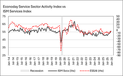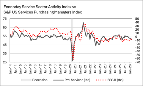 *The ESSAI is an average of seasonally adjusted indexes from the Federal Reserve district bank surveys of the non-manufacturing sector. The districts correspond with about 48 percent of the US labor force. An index above 0 indicates expanding activity and below 0 indicates contracting activity.