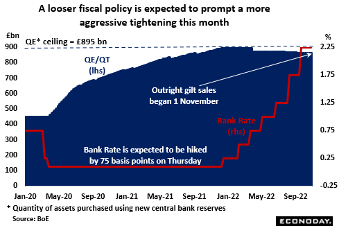 At one point it seemed that the economic and political chaos prompted by the Truss government’s mini-budget in September would completely upend the BoE’s plans for monetary policy. However, the subsequent succession of fiscal policy U-turns and, ultimately, the PM’s own resignation seem to have restored some semblance of normality to financial markets and mean that both official interest rates and the QT programme can resume something close to the paths that the bank originally envisaged. That said, the revolving door at No.10 Downing Street that has seen three prime ministers pass in and out in seven weeks has clearly damaged UK’s international standing. At the same time, fiscal policy will still be more stimulative than before the mini-budget. Consequently, not only over the medium-term are domestic bond yields now likely to be higher than they would otherwise have been but the bank is also widely expected to step up the pace of its tightening on Thursday.