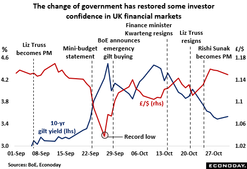 With the economy and inflation moving in different directions, the bank’s policy decision this week will not be an easy one. However, at least the financial backdrop is now looking much less of a constraint than it did a month ago. Following the appointment of Jeremy Hunt as the new Chancellor of the Exchequer and the subsequent decision to replace of PM Liz Truss with the fiscally prudent Rishi Sunak, both the pound and the gilt market have largely recovered their earlier losses. In fact, the pound, which slumped to a record low against the dollar on 26 September, is currently trading close to 6-week highs. Nonetheless, while investors seem prepared to give the new administration the benefit of the doubt for now, the upcoming Autumn Statement due on 17 November will need to show government borrowing falling significantly over the medium-term or there will be a sizeable negative reaction. As it is, even the promise of a reduced amount of planned fiscal stimulus has still left financial markets expecting interest rates to be raised somewhat further than before the mini-budget. Futures prices currently put 3-month money rates at just under 4 percent at year-end before peaking at close to 4.75 percent in the middle of 2023. Just ahead of the September MPC meeting, next year’s high was seen at only 4.5 percent.