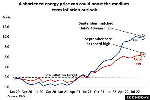 Thursday will also see the BoE update its economic forecasts in a new Monetary Policy Report (MPR). It will do so having seen headline inflation in September regaining July’s 40-year high (10.1 percent) and, more ominously, the core rate (6.5 percent) going one better and claiming a new all-time peak. In fact, the inflation outlook remains highly uncertain. On the positive side, last month the market regulator (Ofgem) introduced the latest energy price adjustment but, courtesy of the Truss government’s Energy Price Guarantee (EPG), average household energy bills will now be capped at £2,500 per year rather than the £3,549 ceiling previously envisaged. This is still an increase of 80 percent or so on the year but means that the boost to inflation will be much less than expected before. To this end, the BoE now seems to think that headline inflation in October will be about 11 percent, several percentage points less than before the new price freeze came into effect. However, against that, the new chancellor has made the medium-term picture more complicated by shortening the duration of the EPG from 24 months to just six. The government will review it next April but, unless extended, energy market developments might mean inflation starts to climb again when, under the former 2-year plan, it would most likely have been coming down.
