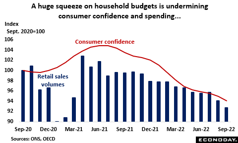 In any event, high and rising inflation is having a significant impact on consumer spending. Retail sales volumes fell in six of the seven months to September with purchases of food, where prices have climbed more than 14 percent on the year, losing ground every month since January. The downturn reflects an ongoing deterioration in consumer confidence that, according to the OECD’s measure, has worsened steadily since the middle of last year and saw yet another record low in September. Weakness in household spending will have been a factor in a probable contraction in real GDP last quarter and will no doubt play a major role in tipping the wider economy into recession by year-end. Total output in August fell for the second time in the last three months and was only unchanged from its level in February 2020, just before the arrival of Covid.