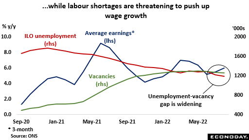 Still, crucially for the bank, a weakening economy has yet to have any real impact on the labour market which remains very tight. Payrolls rose a monthly 69,321 or 0.2 percent in September, extending the unbroken run of gains that began back in March 2021. At the same time, joblessness is still trending down and while at a slower pace than earlier in the year, the ILO unemployment rate has still eased to its lowest reading since the three months ending February 1974. As a result, the shortfall between available workers and vacancies has continued to increase. In turn, this is helping to boost wage growth which, at currently 6.0 percent, stands at its highest mark since May and, more importantly, well above what the BoE MPC would consider as consistent with meeting the inflation target on a sustainable basis.