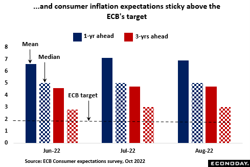 Just as worrying for the ECB, there has also been little evidence that higher interest rates have had much impact on how households perceive future inflation. According to the ECB’s latest consumer expectations survey (CES), inflation over the coming year (median 5.0 percent) and in three years’ time (median 4.7 percent) is seen remaining very sticky around the levels anticipated before interest rates were first hiked. As such, they are still well above target. This view was broadly supported by the EU Commission’s economic sentiment survey which found household expectations last month climbing back to around their levels in June. Expected selling prices in manufacturing and services similarly picked up and all gauges were markedly higher than their respective historical norms.