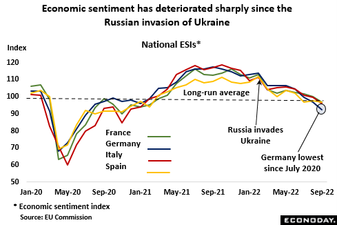 However, the same survey also points to a sustained, sharp, and widespread, deterioration in Eurozone economic sentiment. For the region as a whole, the composite index has fallen every month since Russia moved into Ukraine and in a number of cases the declines have been amongst the steepest seen outside of the Covid period. Indeed, confidence in September hit its lowest level since November 2021 at the start of the Omicron wave. All of the larger four member states have seen marked falls with the slide in Germany, now at its weakest level since July 2020, particularly acute. Third quarter Eurozone GDP might have kept its head above water but with the flash October PMI survey finding private sector business activity contracting at the fastest rate in 23 months, the fourth quarter is very likely to see total output post an absolute decline. In any event, aggressive ECB tightening combined with possible energy shortages over the winter must make for downside risk.