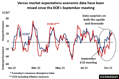 That said, at least since the September meeting there has not been any sustained downside bias to the surprises in the economic data. Econoday’s consensus divergence index (ECDI) which measures how recent economic activity in general has performed versus market expectations, has been both positive and negative. This indicates that the forecasters have broadly got the big picture right in which case any recession should not be significantly deeper than currently discounted. Inflation is clearly the brightest blinking dot on the central bank’s radar currently but any signs of a surprisingly sharp downturn in the real Eurozone economy would probably at least dampen the appetite for large interest rate hikes over coming months.