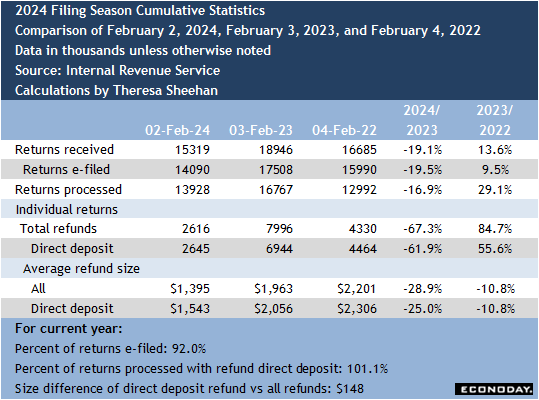 Third there’s the arrival of tax refunds. The IRS filing season opened on January 29. Those taxpayers who expect refunds and/or whose returns can be prepared quickly are already filing. It is too early to say with confidence, but the initial data from the IRS suggest that tax refunds are smaller this year by a noticeable margin. This probably reflects the rolling off of pandemic relief over the past three years. Early filers tend to get larger refunds – mainly because those who owe a tax payment wait until the last minute – and those who get their refund by direct deposit also file early to get the money more quickly than a paper check. In the first week of IRS filing season statistics, refunds averaged $1,395 with the average refund size for direct deposit at $1,543. Some of this will go into immediate spending, some may go into savings, and some may be used for debt reduction.