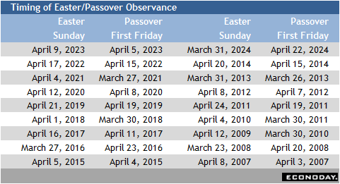 Fourth, the timing of the Easter observance versus the start of Passover is unusual this year. Easter Sunday falls on March 31, but the first Friday of Passover isn’t until April 22. Retailers are likely to be offering a lot of Easter-themed merchandise at discounts in March and most of the associated sales will take place a little earlier than the more usual first week or two of April. However, the later timing of Passover could spread some of the retail activity over a longer period. In any case, March is likely to benefit to the detriment of sales of April.