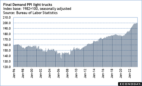 The value of quality changes for 2024 light trucks averaged $230.98 in the October PPI. This is 11.3 percent of the $2,044,80 average increase in manufacturers’ invoice price change from last year. The retail equivalent is $245.19, or 11.4 percent of the average $2,155.62 manufacturers’ suggested list price compared to a year ago. The quality change is in improvements to powertrain and infotainment systems, and changes in levels of standard or optional equipment.