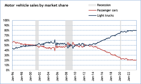 The November 2023 release is for the 2024 model year. The numbers support a trend that began in the mid-1990’s when consumers’ appetites for vehicles in the light trucks category – which includes minivans, SUVs, and crossovers – left passenger cars with a much smaller share of sales. Manufacturers took note and light trucks received more upgrades in terms of comfort and safety consistent with increasing use as a family vehicle. By 2020, light trucks regularly accounted for 75 percent or more of all sales.