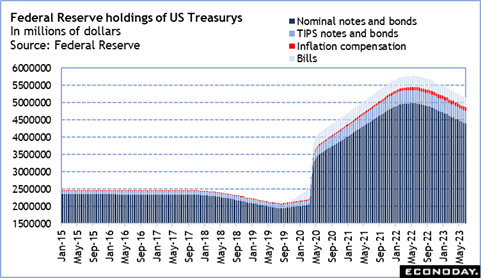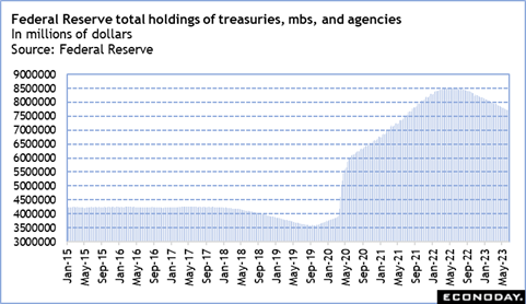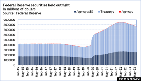 At the start of June 2022, the Fed’s holdings of US treasuries, mortgage-backed securities, and agencies was $8.480 trillion. Routine reductions have brought the reserves down by more than $785 billion to $7.694 trillion. Compared to a year ago, this is visible progress. However, there is a long way to go before the level looks anything like the “ample reserve balance” that the FOMC settled on just prior to the pandemic. It is a not unreasonable concern that the next shock to the economy that triggers a need for rate cuts could be bad enough to take interest rates back to the effective lower bound (ELB) and bring another round of large-scale asset purchases back into play before the balance sheet has normalized.