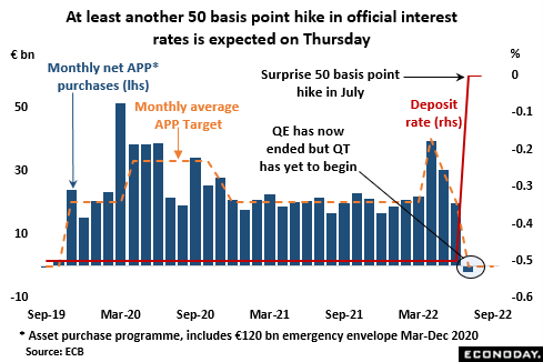Meantime, although QE finally ended in July, QT has yet to begin. The bank is fully reinvesting maturing QE assets acquired under the asset purchase programme (APP) and in July indicated that it would continue to do so “for an extended period of time” after rates began to rise. For the PEPP, which was terminated in March, full reinvestment will remain intact until at least the end of 2024. Such action will help keep the ECB’s balance sheet broadly stable. However, with inflation moving further above target, some GC hawks are pressing to start talks about outright asset sales now and it may yet be that active QT begins a good deal earlier than seemed likely just a few weeks ago. Any move on this front would tighten policy still further.