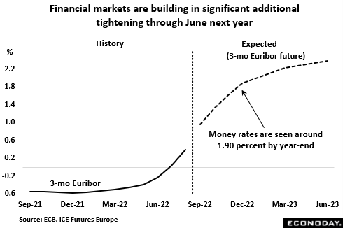 In any event, financial markets are convinced that key interest rates have some way to climb yet. From 0.76 percent currently, futures markets see 3-month money rates at around 1.90 percent by year-end and almost 2.4 percent by the middle of 2023. Rising short-term borrowing costs will continue to put upside pressure on bond yields, particularly those in the higher indebted countries so investors will be listening out for any additional information on the Transmission Protection Instrument (TPI). This was introduced in July and is specifically aimed at limiting bond spreads to strengthen financial stability and ensure the smooth transmission of policy across the region. So far, the bank has indicated that the scale of any TPI purchases will be conditional upon meeting a range of fiscal and other criteria and will depend on the severity of the risks being faced. Importantly though, purchases are not restricted ex ante.