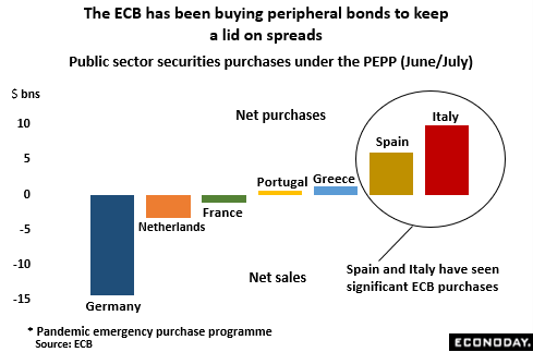 As it is, the ECB has been busy behind the scenes adjusting the composition of its pandemic emergency purchase programme (PEPP) to protect the more vulnerable markets. Indeed, reinvestment from the PEPP remains the first line of defence and the bank has felt obliged to buy sizeable amounts of Greek, Portuguese and, in particular, Spanish and Italian bonds using the proceeds from sales of their maturing German, Dutch and French counterparts. Information is only available on a bimonthly basis but data for June and July put net Italian purchases at some €9.8 billion and net Spanish buying at €5.9 billion. The acquisitions were largely funded by net German sales of €14.3 billion so as not to add to QE. Of note, Italy could soon offer a sterner test of the ECB’s ability to control market volatility as snap elections, due on 25 September, are expected to see a swing to the populist parties. Such an outcome could potentially jeopardise the attainment of key fiscal policy targets and so restrict the ECB’s ability to buy BTPs as well as risking stalling the disbursement of vital EU recovery funds.