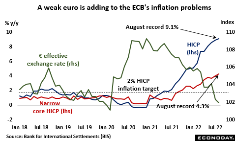With Russia having steadily reduced and now, essentially cut, gas supplies to Europe, inflation developments since the July meeting have been disappointing. The flash August HICP hit a 9.1 percent yearly rate, up from July’s final 8.9 percent and yet another record high. At 4.3 percent, the narrow core rate gained an even larger 0.3 percentage points and similarly achieved a fresh all-time peak. Moreover, according to the bank’s own July survey, inflation expectations are on the rise too with households seeing the total 3-year ahead rate at 3.0 percent, up from 2.8 percent in June. Not helping matters is the weakness of the euro, a development that the minutes of the July meeting highlighted as being of increasing concern. Measured against a basket of currencies the euro has lost about 7 percent since the start of last year and, more importantly for inflation, just yesterday saw its weakest level versus the dollar in two decades. Exchange rate weakness at a time of rising global inflation has made the ECB’s job all the harder and it would not be surprising to hear President Lagarde makes some comments to the effect that current levels are not seen favourably.