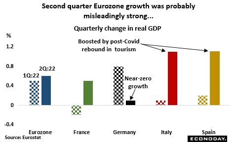 Meantime, despite signs of possibly sharply slowing growth, the Eurozone real economy appears to have been relegated to a back seat in the policy-making process. Indeed, less than two weeks ago Isabel Schnabel, the head of the ECB’s market operations, said that policy should stay on the normalisation path even in the event of a recession. Headline second quarter GDP was surprisingly strong but benefitted from a rebound in tourist inflows into the main holiday destinations, notably Italy and Spain where international tourist spending was up more than 500 percent on the year as Covid restrictions were lifted. Quarterly growth in Germany was just 0.1 percent and a seemingly respectable 0.5 percent rate in France was dominated by exports. Since then, the cost-of-living crisis has become much more acute and borrowing costs have climbed sharply along the entire yield curve on the back of actual and expected ECB tightening.