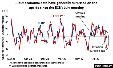 All that said, not only is the ECB now much more focused on tackling inflation than bolstering growth but the Eurozone economic activity has actually been outperforming market expectations anyway. Since the July meeting, Econoday’s economic consensus divergence index (ECDI) has been almost wholly in positive surprise territory. Its inflation-adjusted counterpart (ECDI-P) has largely followed suit although very recently has fallen below zero. However, the unusually wide gap here simply highlights the fact the main positive data surprises have been with inflation and, as the hawks will be keen to emphasise, that is what the ECB policy is all about.