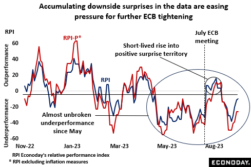 In fact, Eurozone economic activity in general has been disappointingly soft for some time. Apart from a brief rally above zero in mid-August, Econoday’s relative performance index (RPI), which measures how the overall economy has fared versus market expectations, has been consistently in negative surprise territory since May. And the ongoing accumulation of downside surprises is clearly troubling some GC members. It is not as if forecasters were optimistic about the economic outlook in the first place; rather, even predictions of sluggish activity have turned out to be overly positive. All of which must increase the chances that, even if it has yet to begin, a sustainable trend decline in core inflation is not too far away.