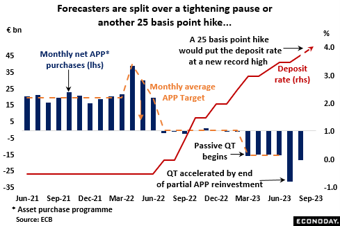 For Thursday’s announcement, much will depend upon the ECB’s updated economic forecasts. In June, the projections showed both headline and core inflation above 2 percent through 2025, implicitly conceding that policy was still not restrictive enough. These will need to be trimmed if interest rates are not to be hiked again, particularly since, as the July minutes made plain, most on the Governing Council believed it preferable to tighten monetary policy further than to not tighten it enough. This view may well still hold come Thursday and some members will certainly want to press on with tightening. However, it seems that many, possibly most, members now believe that at least a pause in the cycle is justified. That said, note that even if policy is left on hold, the ECB will almost certainly want to stress that a pause should not be seen as a peak and early rate cuts are simply not an option.