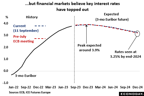 In recent weeks, financial markets have become increasingly convinced that key interest rates have peaked and that the next move will be down. At 3.90 percent, the high currently priced in for 3-month money rates is little changed from that seen just before the July meeting. Anticipated ECB easing in 2024 also remains essentially unrevised, putting rates at about 3.25 percent by year-end. However, that might well be too aggressive for the ECB.