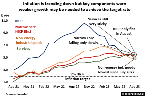 After a disappointingly strong July report, the flash HICP data for August were much better behaved. On the negative side, at 5.3 percent, headline inflation failed to slow for the first time since last October. However, the narrow core rate dropped a couple of ticks to 5.3 percent, matching an 8-month low, while the wider measure omitting just unprocessed food fell an unusually sharp 0.4 percentage points to 6.2 percent, its weakest print since September last year. Moreover, having accelerated almost every month so far in 2023, the service sector rate dipped a tick to 5.5 percent. Still, all the gauges remain far too high and, in particular, progress on reducing the underlying measures has been too slow to instil much confidence that the 2 percent target rate can be reached within an acceptable timeframe.