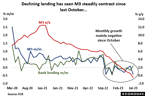 Inflation may be well above target but increasingly restrictive financial conditions have contributed towards a sharp deceleration in the ECB’s main monetary aggregate. Annual M3 growth has slowed from a peak of 12.6 percent at the start of 2021 to minus 0.4 percent in July, its first sub-zero post in some 13 years. Strongly negative base effects have been an important factor but, significantly, monthly growth has also been negative in five of the last six months. Sharply higher borrowing costs and tighter bank credit standards have depressed borrowing by households and non-financial corporations and the ongoing phasing-out of the ECB’s targeted longer-term refinancing operations (TLTROs) has made bank funding all the more expensive. Declining liquidity will add to downside pressure on economic activity.