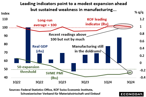 Leading indicators point to slightly above average growth over coming month although the outlook for manufacturing, despite a sharp jump in August’s SVME PMI (49.0), remains generally gloomy. In fact, without a pick-up in global growth, the recovery could well slow as unemployment continues to rise and flatlining consumer confidence keeps a lid on household spending.