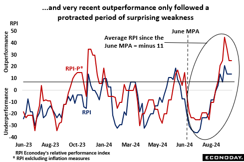 Very recent economic data have actually proved stronger than expected, lifting Econoday’s Relative Economic Performance Index (RPI) back above zero. However, the last nine months have been dominated by downside surprises and, since the June MPA, the RPI has averaged minus 11. Over the same period, the mean value of its inflation-adjusted counterpart (RPI-P) was rather stronger, but still negative at minus 3. Accordingly, the broader economic picture still favours a slightly looser monetary stance.
