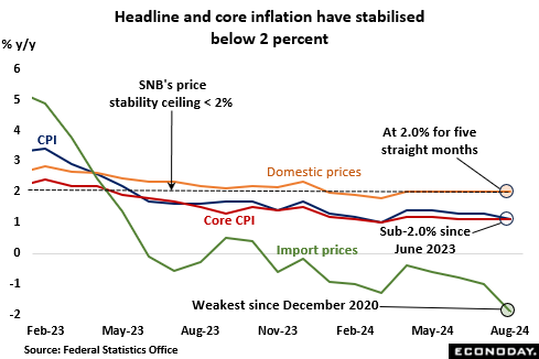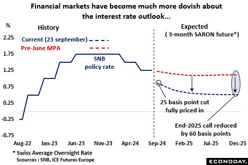 In fact, financial markets have significantly lowered their expected profile for interest rates through 2025. A 25 basis point reduction this week is fully priced in and 3-month money rates are now seen bottoming around 0.5 percent in the middle of next year. That would be nearly 0.6 percentage points beneath what was predicted just before the June MPA. If correct, it would almost certainly mean that the SNB’s easing cycle will be completed well ahead of most other major central banks.