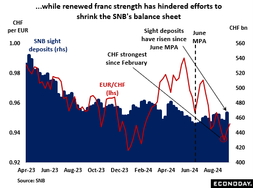 Efforts to shrink the SNB’s bloated balance sheet have been largely unsuccessful this year. At CHF812.4 billion in June, total assets were more than 2 percent larger than at the end of 2023. In part, this reflects the strength of the Swiss franc which has restricted the scope for the disposal of foreign currency holdings. Amidst the recent heightened volatility in financial markets, the safe haven appeal of the Swiss unit has been further boosted by the unwinding of some longstanding short yen carry trades. Indeed, at CHF0.930 versus the euro early last month, the cross-rate was probably close to the central bank’s pain threshold. As such, some limited depreciation might be welcome, further increasing the likelihood of a rate cut.