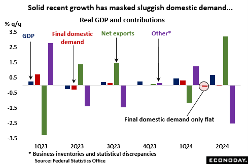 Economic growth looked surprisingly robust in the second quarter. Following an unrevised 0.5 percent quarterly increase at the start of the year, GDP expanded fully 0.7 percent, its best performance since the second quarter of 2022. However, final domestic demand was only flat as limited gains in household and government spending were offset by a sizeable decline in gross fixed capital formation, worryingly its fourth contraction in the last five quarters. Consequently, growth was heavily dependent upon net exports although, even then, both sides of the balance sheet posted hefty falls.
