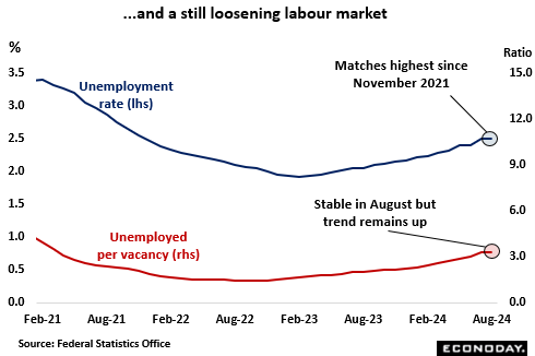 Meantime, the labour has continued to loosen, albeit still only gradually. Since the June MPA, unemployment has risen more than 7,300 or nearly 7 percent, and, at 2.5 percent, the current jobless rate matches its highest reading since late 2021. Vacancies last month increased too but the trend remains down and the August level was still some 22 percent below the level a year ago. Indeed, the ratio of unemployed to vacancies matches its highest mark since March 2021.