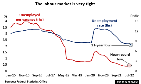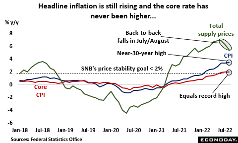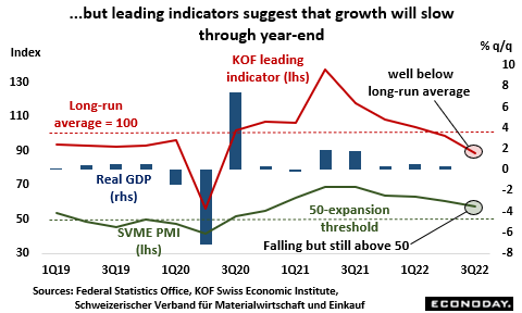 Indeed, as the Ukraine war has rumbled on, forward-looking indicators have pointed to a potentially sharp slowdown in economic growth. The KOF’s leading economic index has slumped more than 16 points since April and in August touched its weakest level since July 2020 in the midst of the first Covid wave. The SVME PM remains much more optimistic but this too is well off recent highs and, according to the OECD, a steady and ongoing decline put consumer confidence last month at its lowest mark since March 2021. The State Secretariat for Economic Affairs (SECO) is due to update its economic forecasts tomorrow.